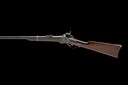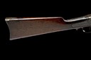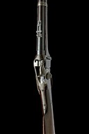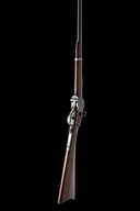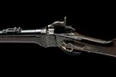 originally an 1863 percussion carbine converted by the factory in 1868 to central fire by re-lining the barrel and changing the breech-block, with round tapering 22in. barrel, block and blade fore-sight, small elevating ladder rear-sight, the top of barrel at breech marked 'NEW MODEL 1863' (faint), colour hardened receiver with vertical sliding breech-block operated via an under-lever forming the trigger guard, traces of the '1848' patent details to left side of receiver, the colour hardened lock with 'C. SHARPS PAT. OCT. 5TH. 1852', walnut butt-stock with iron heel-plate, the left side stamped with the rework inspector's mark 'DFC' in a ribbon, iron saddle-bar with loose ring and walnut splinter fore-end with single barrel-band