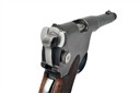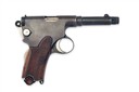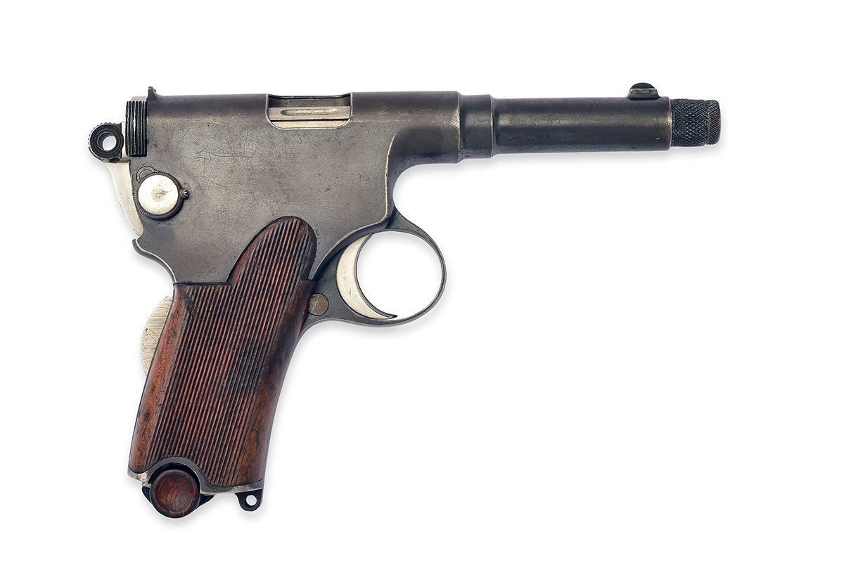 circa 1913, with 4 1/4in. barrel within a stepped round and blued shroud, knurled muzzle-cap, block and blade fore-sight, integral frame and receiver body with standing notch rear-sight at rear, the left side-plate marked 'FEGYVERGYAR-BUDAPEST . FROMMER-PAT', internal brushed bright bolt with rear cocking piece, external hammer, hold open device and take-down wheel, grip safe to back-strap, side magazine release, walnut grips with narrow vertical grooves and detachable magazine with wood-base (base cracked), much finish remaining