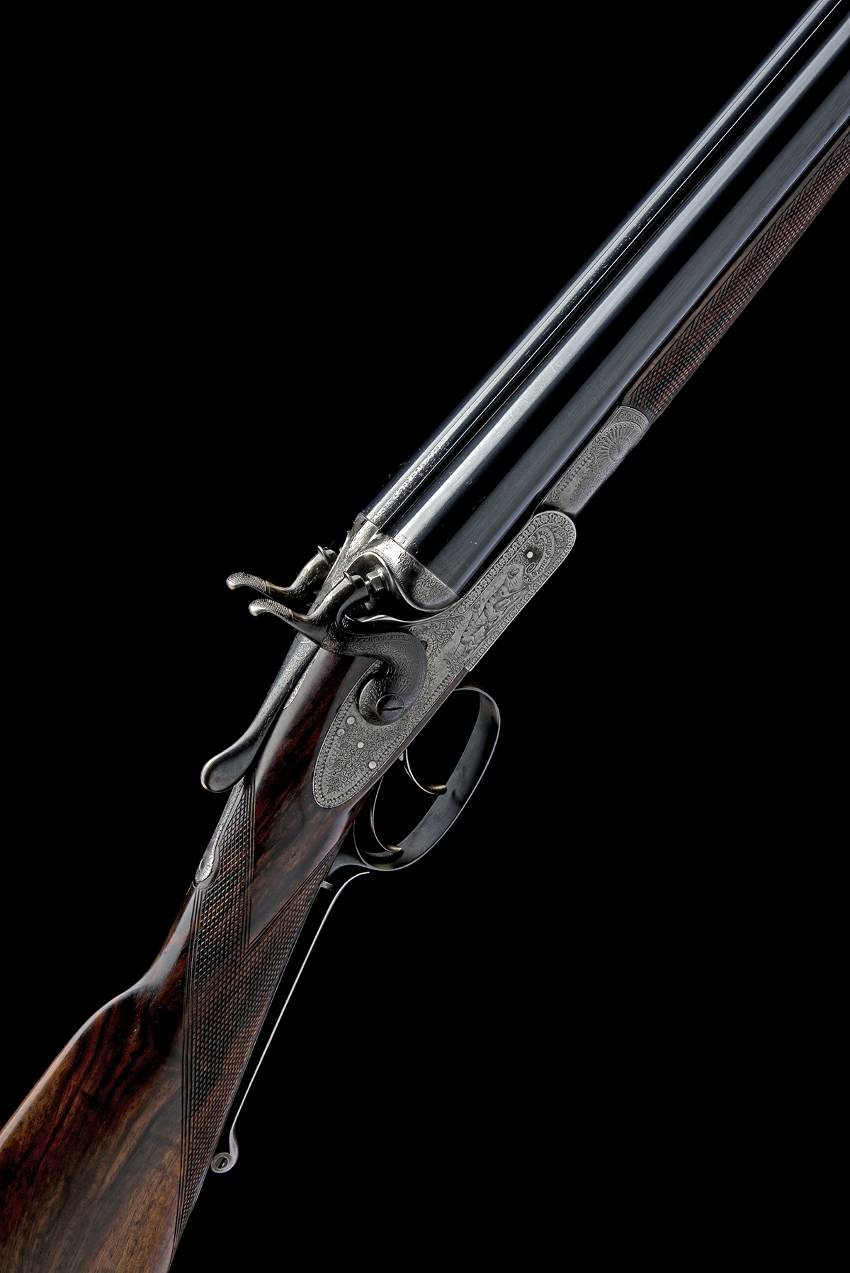 circa 1875, serial number on barrel loop only, 30in. sleeved nitro barrels (in 1980), retaining original rib engraved 'James McCririck Ayr' (rubbed), 2 1/2in. chambers, bored approx. 1/4 and 3/4 choke, single-bite snap toplever action, possibly a variation on W. Ansell patent bolting mechanism, patent no. 2349 of August 7th 1872, operating a single sprung T-cross section bolt locking into the rear lump and extractor, action flats marked 'ECLIPSE TRADEMARK' and an 'A' in a triangle over 'PATENT. no. 217', hollowed flats, carved percussion fences, rebounding sidelocks with large dolphin hammers, grip safety, fine acanthus scroll engraving with varied ornate borders, the lockplates with central scenes of pointer, the underside with a scene of a wading hunter with dog and game, the triggerguard with two further pointers, brushed and blued finish, 14 3/8in. well-figured stock with engraved steel heel and toe plates, wooden insert to centre, fore-end with Anson push rod release (missing finial), weight 6lb. 14oz.