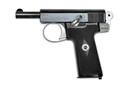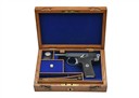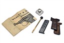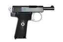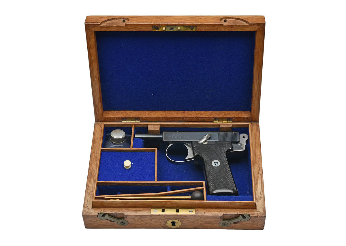 circa 1912, with blued exposed 3 1/2in. barrel, blued slide with full-length sighting groove and signed 'ARMY & NAVY C.S.L. LONDON', the left side with maker's name and address, side safe, exposed hammer, blued frame with plated trigger guard bow, chequered hard rubber grips and detachable magazine, much finish remaining and in its period oak casing lined and compartmented in blue baize and with faceted glass oil bottle, brass cleaning rod, spare magazine, a pair of smooth walnut grips and its original instruction sheet