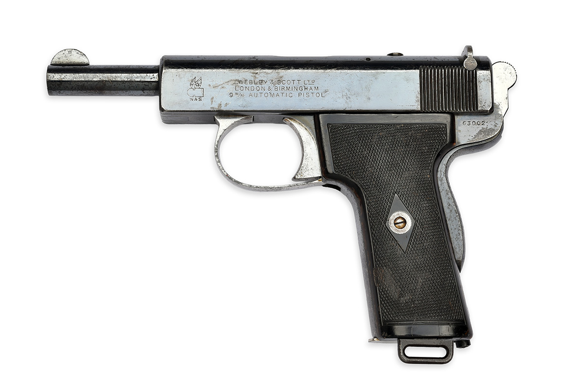 A RARE 9mm (B/L) WEBLEY & SCOTT MODEL 1908 PISTOL, serial no. 263002,