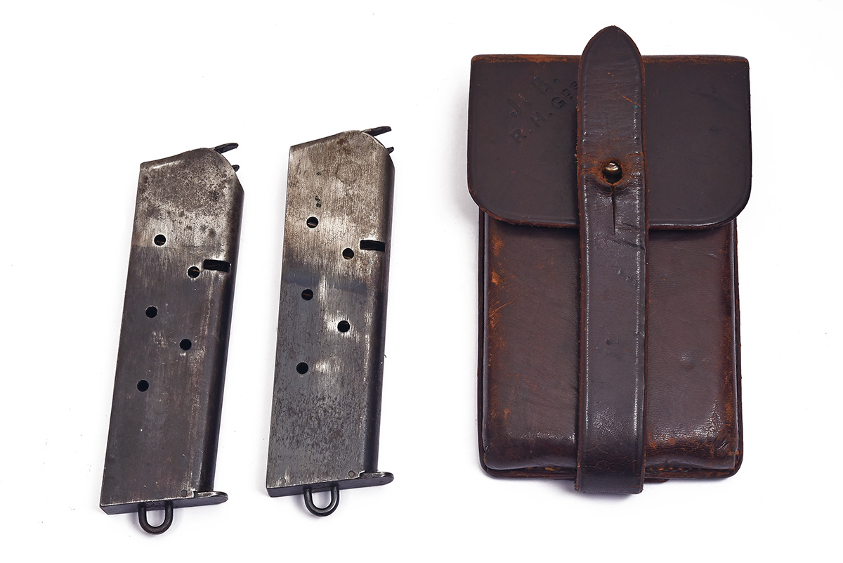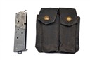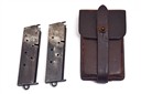 THREE .455 ELEY COLT 1911 MAGAZINES, TWO IN A PERIOD LEATHER BELT-POUCH, ANOTHER IN AN RAF MILLS WEBBING POUCH,