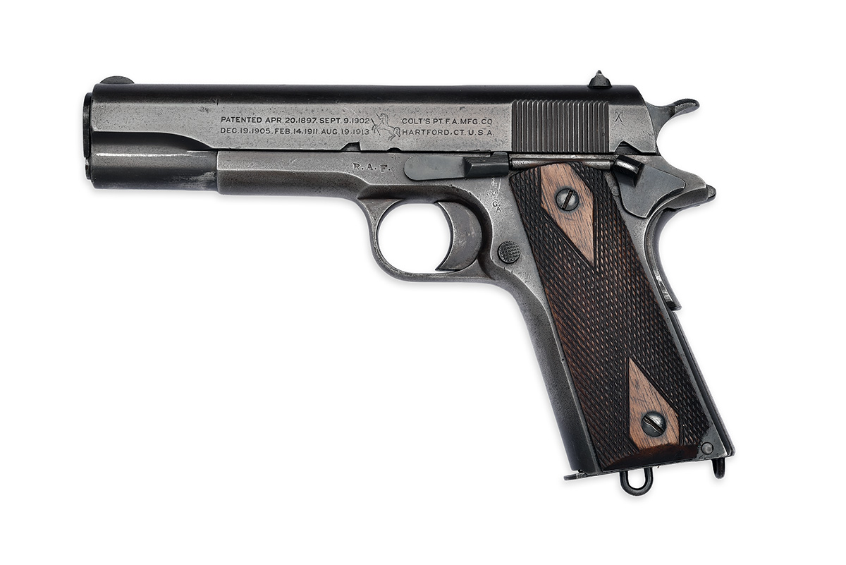 for 1918/19, with 5in. barrel, reblued slide with make, model and patent dates to 1913 (mild pitting below finish), reblued frame with British Ordnance marks and stamped 'R.A.F.', original smooth mainspring housing, beavertail, hammer and safe, chequered walnut grips and correct magazine marked 'CAL .455 ELEY', the base-plate fitted with a lanyard loop, finish thinned and faded