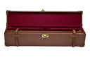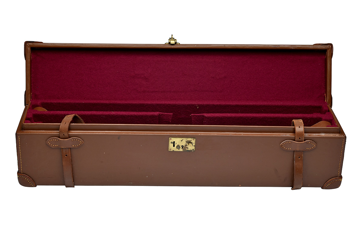fitted for 27in. barrels, the interior lined with maroon baize, brass lock (key missing), leather carry handle