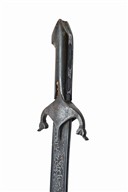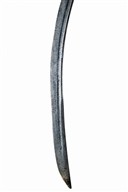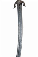 circa 1825, with curved 30 1/2in. blade false edged for the last 9in., blind shallow fuller partially bordered by a further interrupted narrow fuller, large panel containing an arabic inscription to the right side near hilt, a tughra and a further symbol engraved to the left, traces of previous gilt koftgari decoration, moulded iron cross-guard with carved drooping quillions, horn grip-scales with protrusion to the pommel, lacking scabbard