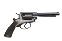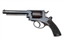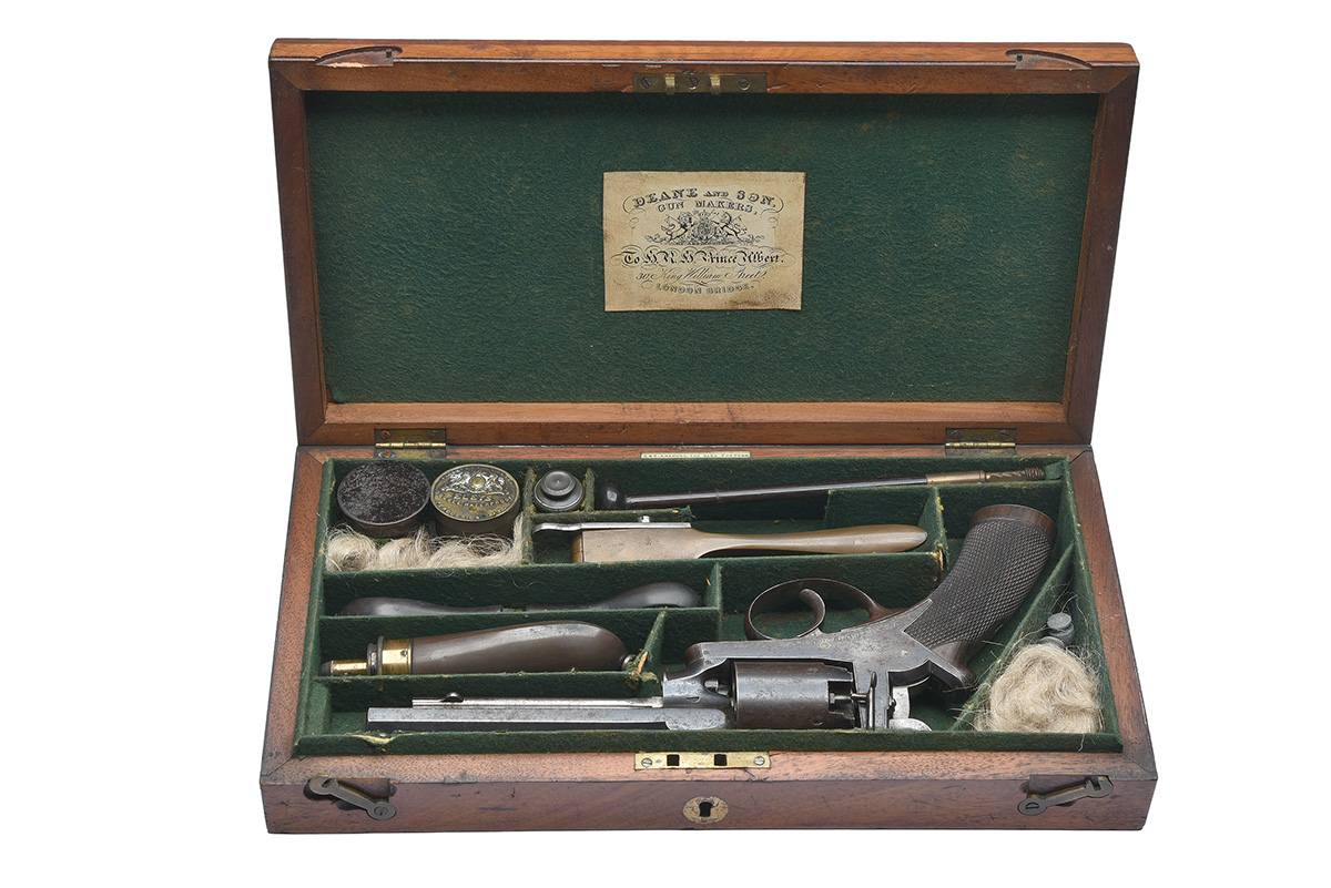 circa 1860, with 6in. blued octagonal barrel, the top-strap signed 'DEANE & SON, LONDON BRIDGE', dove-tailed fore-sight, standing notch rear-sight, two-piece borderline engraved blued frame with swinging cylinder lock, plain cylinder, double action mechanism, chequered walnut saw-handled grip, iron butt-cap, guarded trigger and hinged under-barrel rammer, the pistol retaining a strong amount of original but faded finish and together with its maker's mahogany storage case lined and compartmented in green baize and complete with an Adams mould, flask (mainspring broken), loading rod, turn-screw, nipple-key, lubricating compound and cap-tins, all probably as supplied, the inside of lid with parchment 'Deane Adams & Deane' trade label