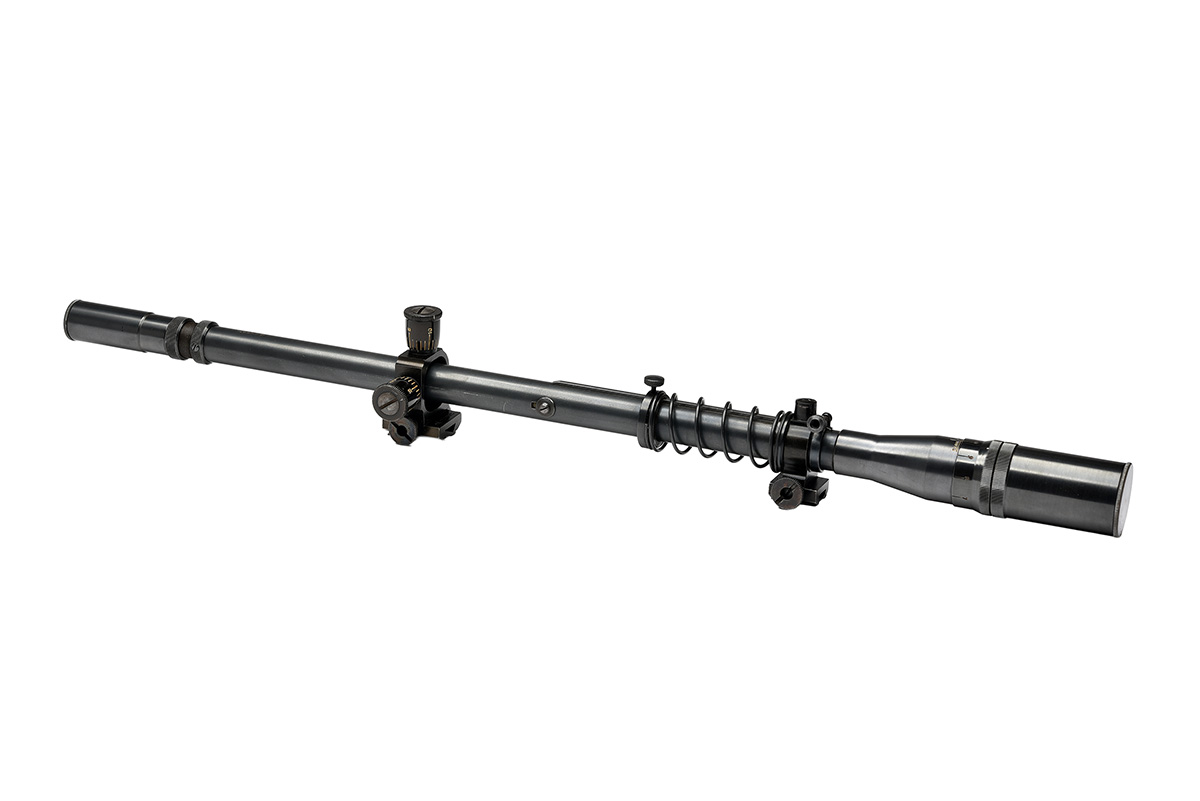 circa 1955, with blued steel 21 1/2in. body signed 'J. UNERTL' together with the serial number, flaring objective lens with parallax adjustment, sliding mounts, the front with stop and recoil spring, the rear with windage and elevation turrets, good external condition with fine crosswire reticule and screw-on lens caps