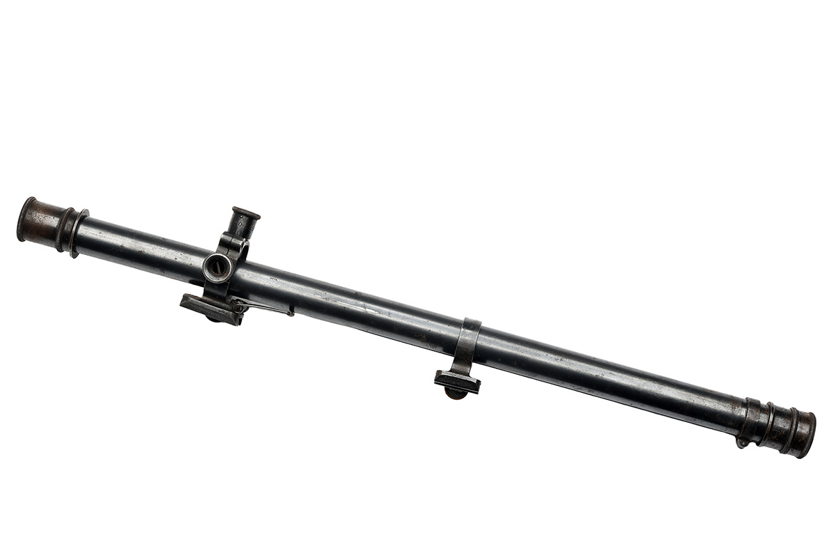 no visible serial number, circa World War One, with blued steel 15 3/4in. body marked 'MANUFACTURED BY THE WINCHESTER REPEATING ARMS CO.' over 'NEW HAVEN, CONN' and 'PATENTED FEBRUARY 9. 1909' flanked by 'A5' to the right side, sliding ring-mounts, the front full adjustable for windage and elevation, the foot bearing a British ordnance inspector's stamp and broad arrow device, the rear with locking ring behind, much original finish remaining and complete with its shaped leather carry-case (derelict, splits and losses)