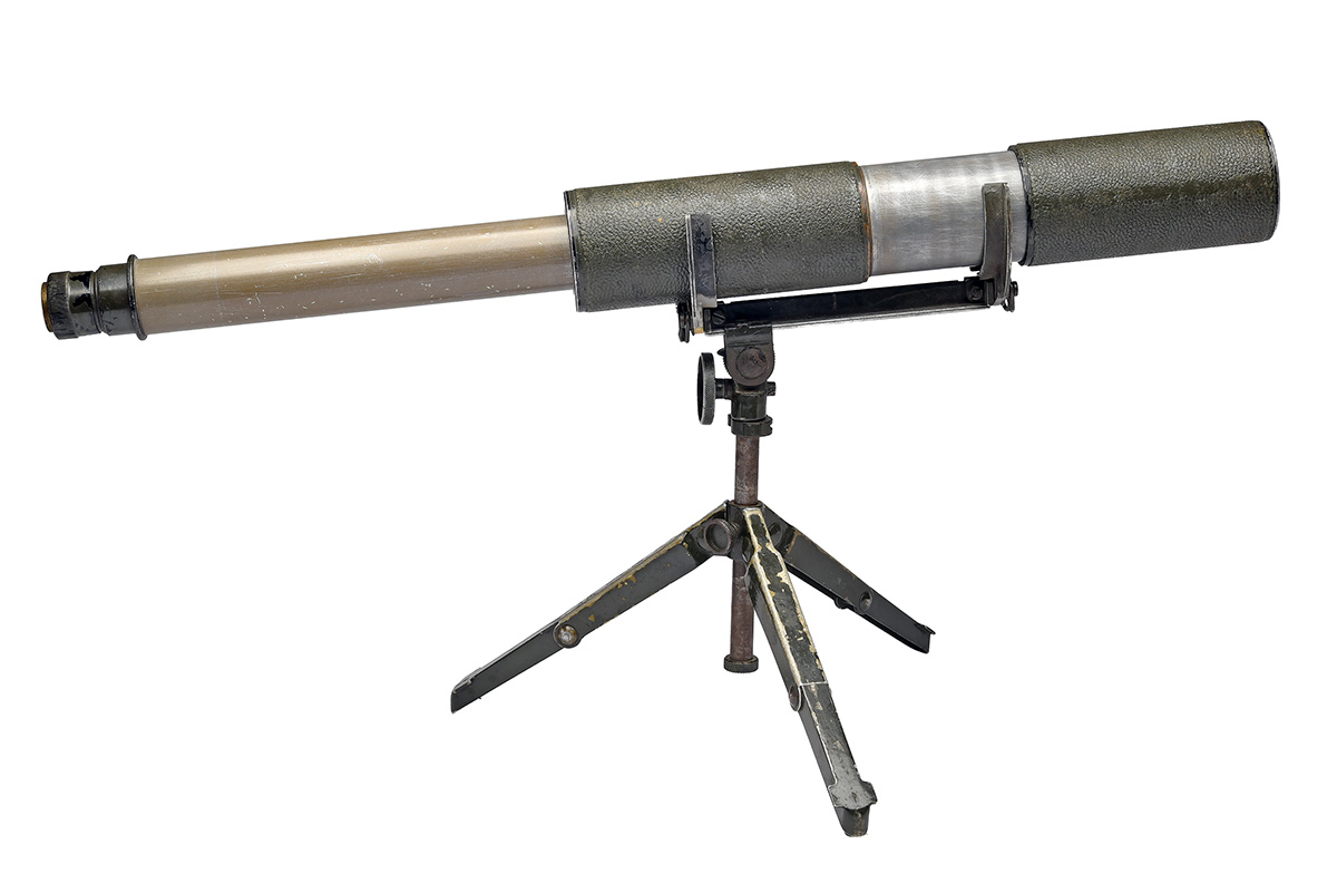 A RARE CANADIAN TELESCOPE, OBSERVING, SNIPER'S 25x50 CMK 1 TELESCOPE WITH TRANSIT CASE AND FOLDING BRACKET,