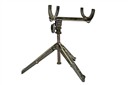 the telescope dated for 1944, with olive green leatherette covered body, forward mounted sunshade, the single draw in green-grey anodised alloy, the rear of telescope marked around the ocular lens 'TELESCOPE, OBSERVING, SNIPER'S CMK 1' above '25x50' and also 'CGB 32 MA' and 'R.E.L. CANADA' over '1944' and '86C' (hard rubber eye-piece absent), 25in. overall extended, in its olive green hard rubber covered aluminium transit case marked similarly but dated 1945, bayonet fitting end-cap (dented), webbing carry strap (split) and with its seldom encountered folding stand or tree-clamp marked 'STAND, INSTRUMENT' also by 'R.E.L. CANADA' and dated 1945