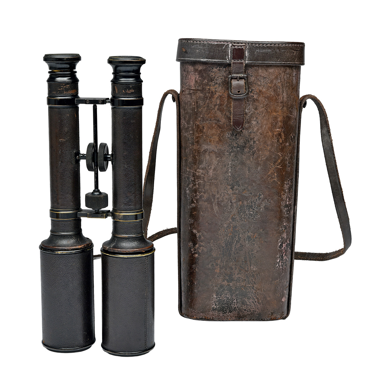 circa 1900, probably English but in the style of Goerz, with blacked brass bodies measuring 17in. fully extended with the shades drawn forwards, a centre-wheel for adjusting focus, another further forwards for adjusting the width between eye-pieces operating on twin parallel slides, leather covered bodies and shades, collector's condition and in their original leather carry case (case restored)