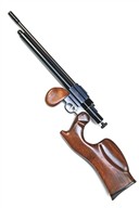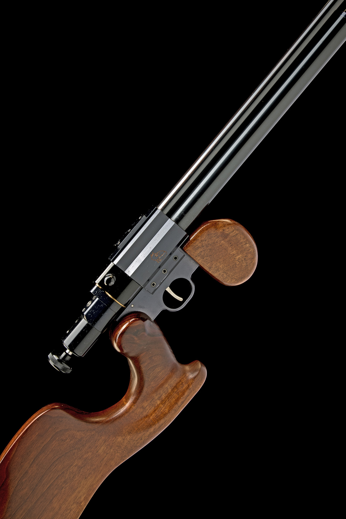 with 19 1/2in. barrel including attached muzzle-brake, rotating swing single-shot breech, large rear-mounted cocking-piece, the left side of action marked with 'BLACK FOX LTD. PORTLAND DT5 2JU', the serial number and a depiction of a seated fox above 'PC1', unusually shaped ergonomic walnut butt-stock, isolated semi pistol-grip fore-end and under-barrel air reservoir, tested, in a cordura gunbag