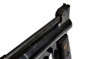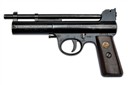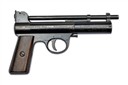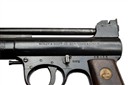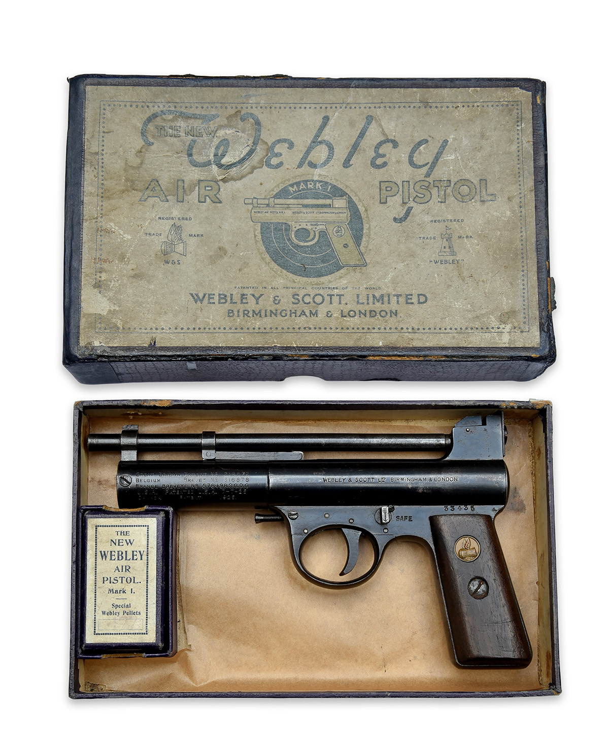 circa 1934, with blued 7 1/8in. barrel, adjustable rear-sight, pull-back barrel-latch, stepped air-chamber with five lines of patents to left side of nose and six lines of patents to the right, makers details to the left at rear and model to the right, rotating safety catch, four pin trigger unit with screw weight adjuster, smooth walnut grips, the left with Webley's 'winged bullet' trademark medallion inset at head, much original blued finish remaining and in its maker's blue card carton with grey label (careful taped repairs) and including a desirable blue card pellet sample carton with the same model designation