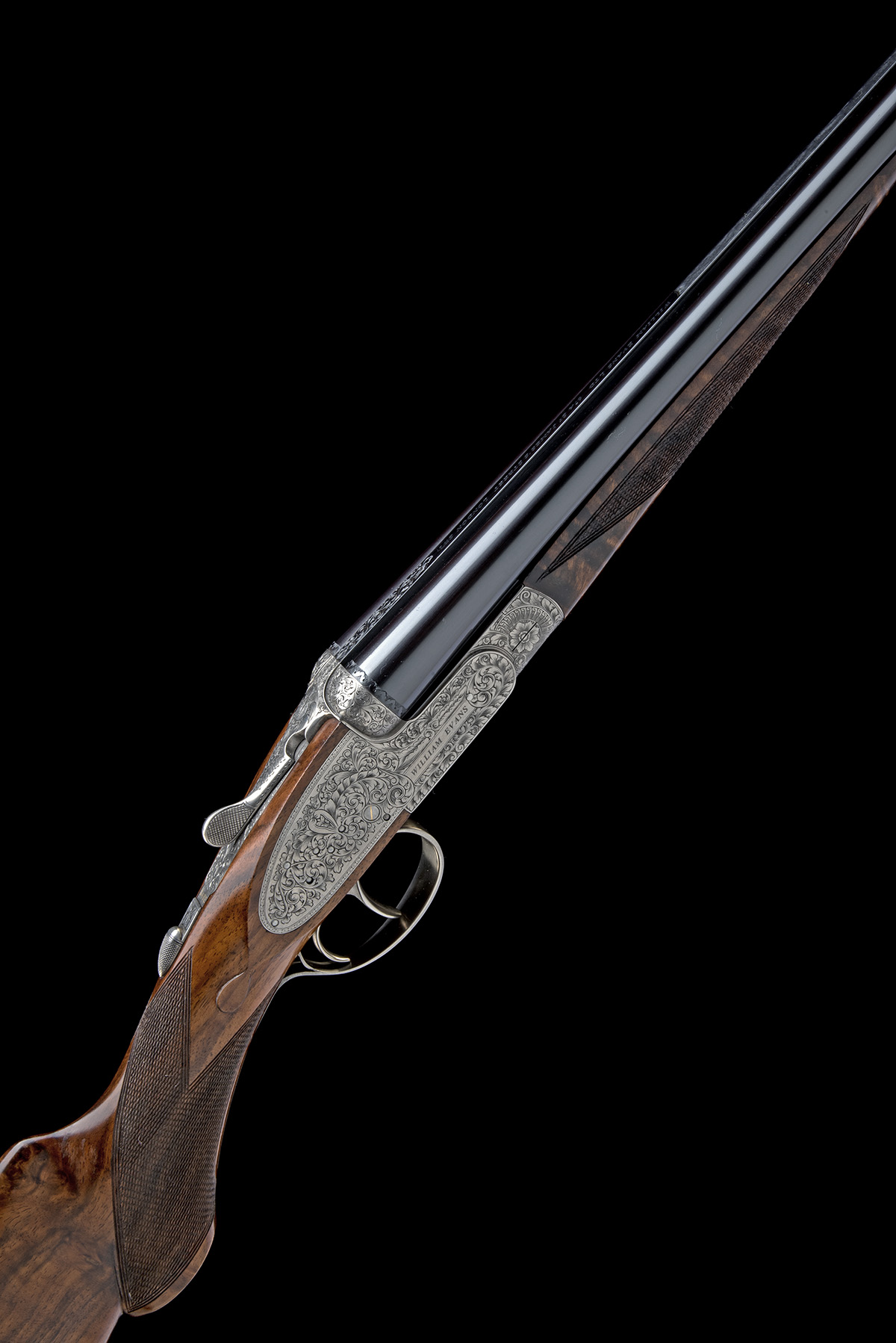 for 2016, 30in. high performance steel proof nitro barrels with matted rib, the breech end engraved 'WILLIAM EVANS LTD. 67A ST. JAMES'S STREET. LONDON SW1.' and with acanthus scroll detailing, 2 3/4in. chambers, bored approx. 1/2 choke, action incorporating Holland & Holland type self-opening system, action and barrel flats marked with the Grulla Armas trademark, automatic safety with gold-inlaid 'SAFE' detail, gold-inlaid cocking-indicators, articulated front trigger, rolled-edge triggerguard, bold acanthus scroll engraving, satin finish, 15 1/2in. figured pistolgrip stock, weight 6lb. 5oz., in its leather case with canvas and leather outer