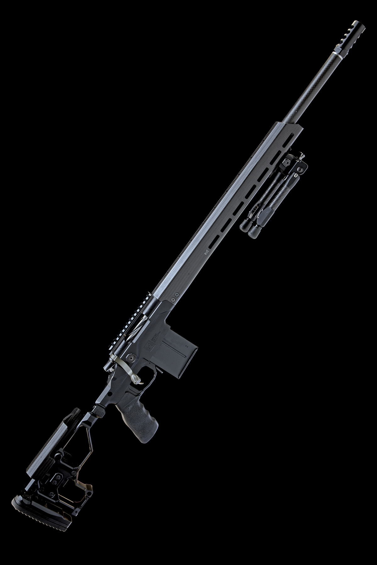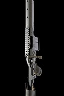 recent, 24in. nitro carbon fibre wrapped barrel with cerakoted adjustable stainless steel baffle break, Christensen Arms Precision machined receiver with spiral fluted bolt, 20 MOA rail mount, two magazines (one 5-shot, one 10-shot), Christensen Arms 7075 aluminium billet chassis with 17in. carbon fibre handguard with M-Lok, fitted with a Spartan Precision Equipment Javelin bipod, folding stock with Magnelock technology and adjustable carbon fibre cheek riser, weight 9lb. 1oz. (5-shot mag) and 9lb. 3oz. (10-shot mag)