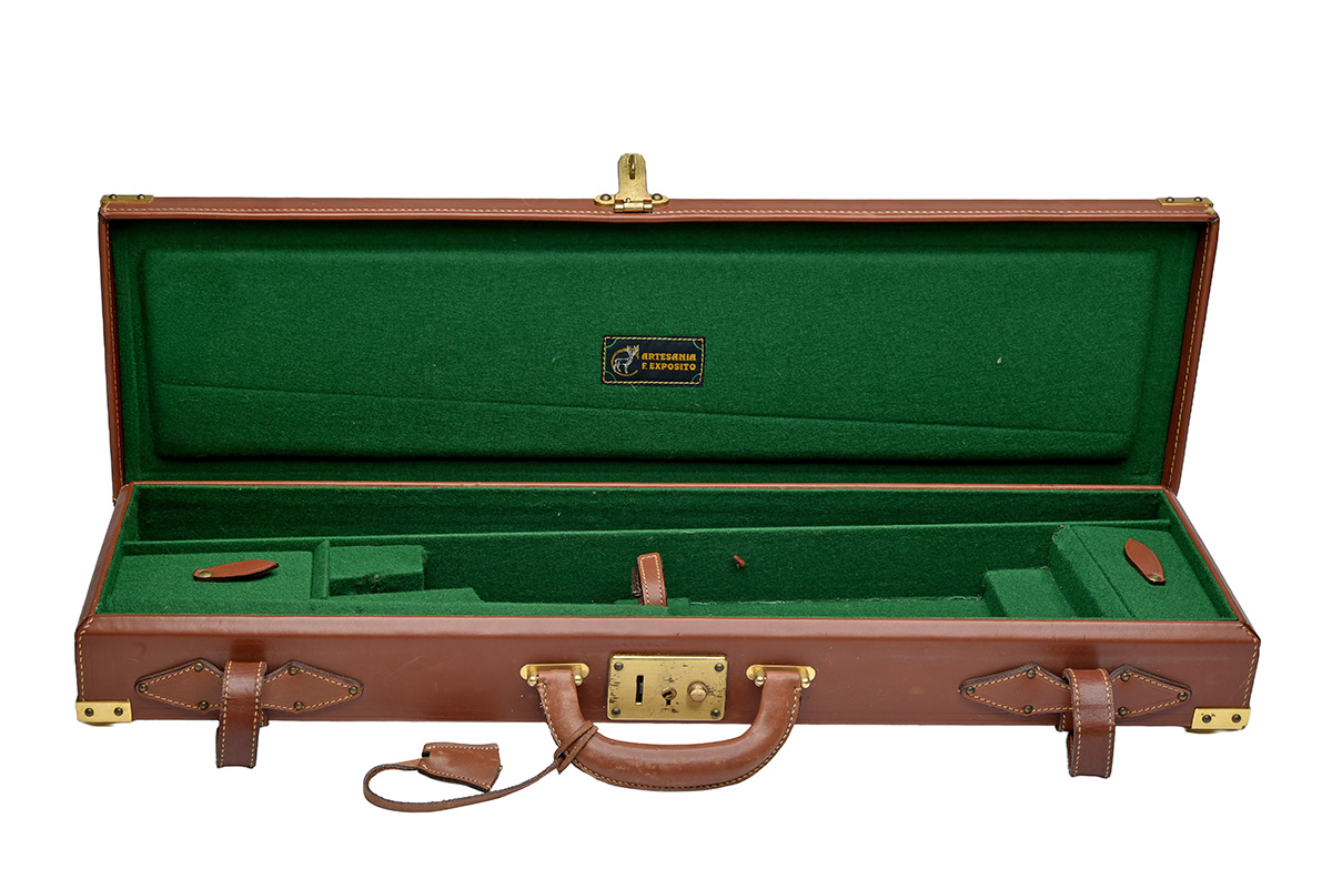 ARTESANIA F. EXPOSITO A BRASS-CORNERED LEATHER SINGLE GUNCASE,