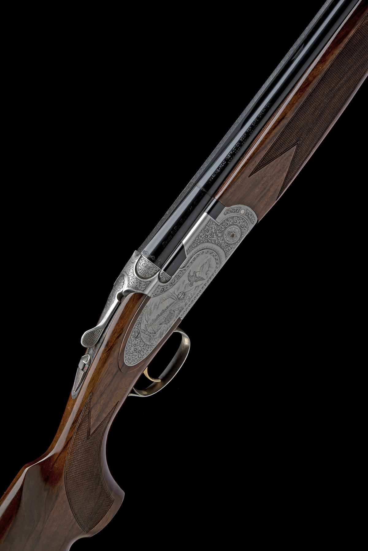 for 2001, 29 1/2in. nitro barrels with 6mm ventilated matt top-rib, 3in. chambers, bored approx. 3/4 and full choke, hold-open toplever, automatic safety with integral barrel selector switch, gold-washed trigger, floral and scroll engraving with game scenes of pheasant and woodcock, the underside with the model designation, the triggerplate signed 'Bottega C. Giovanelli', 14 1/8in. figured pistolgrip stock including buttplate, weight 7lb. 2oz.