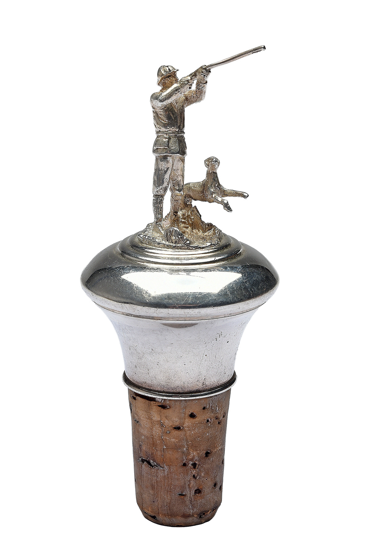 A STERLING SILVER GUN WITH HOUND TOPPED CORK BOTTLE STOPPER,