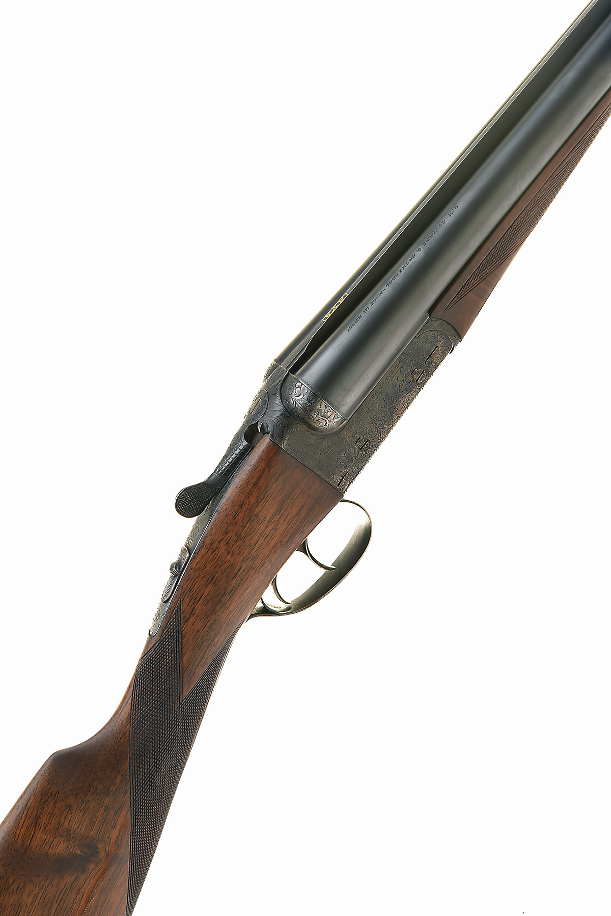 AYA 12-BORE 'MODEL 25' BOXLOCK EJECTOR, serial no. 545702, for 1980, 25in. nitro chopperlump barrels with Churchill-style rib, the breech-end gold-inlaid 'AYA', 2 3/4in. chambers, bored approx. imp. cyl. and 1/2 choke, removable striker discs, automatic safety with 'S' detail, acanthus scroll engraving with floral motifs, retaining much original colour-hardening and finish, 14 5/8in. stock, weight 5lb. 14oz.