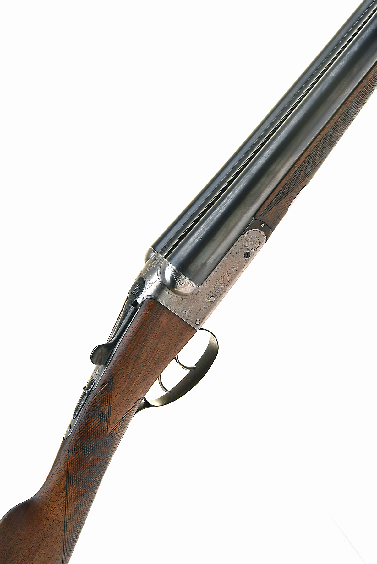 JAS. R. WATSON & CO. 12-BORE BOXLOCK EJECTOR, serial no. 7053, for 1936-7, 28in. sleeved nitro barrels (in 1950), the rib engraved 'JAS. R. WATSON & CO. LONDON. & BIRMINGHAM.', 2 1/2in. chambers, bored approx. 1/2 choke in both, automatic safety, border and acanthus scroll engraving, brushed bright and reblued finish, 14 1/2in. stock, fore-end with Deeley & Edge release catch and horn finial, weight 6lb. 7oz.