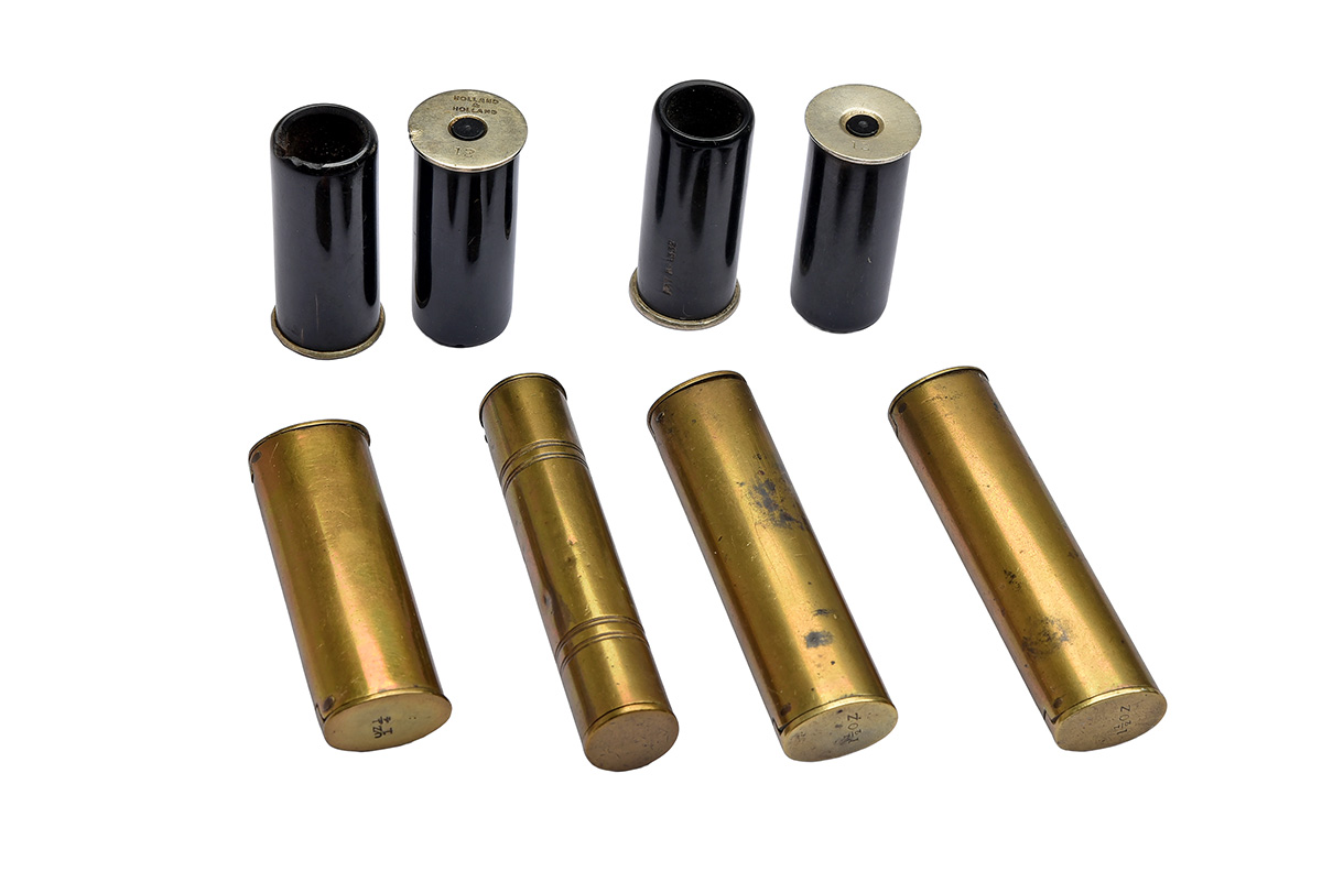 the brass chargers to include a pair for 1 1/2oz. loads signed 'SYKES PATENT, an unusual example of tubular form marked for 1 1/4oz., unsigned and a short example marked 'PATENT' and for 1 1/4oz., the snap caps to include a pair of vulcanite bodied caps with nickel bases signed 'HOLLAND & HOLLAND', the bodies stamped 'PAT 321388', the second pair similar but unsigned, all 12-bore
