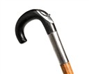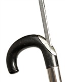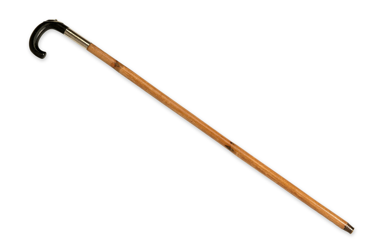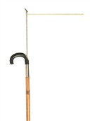 circa 1930, cane shaft with turned brass nose ferrule, vulcanite handle with polished neck-mount, the measuring scale marked in hands and sliding out from the handle through a white metal escutcheon with fold-out brass angle concealed in the measure