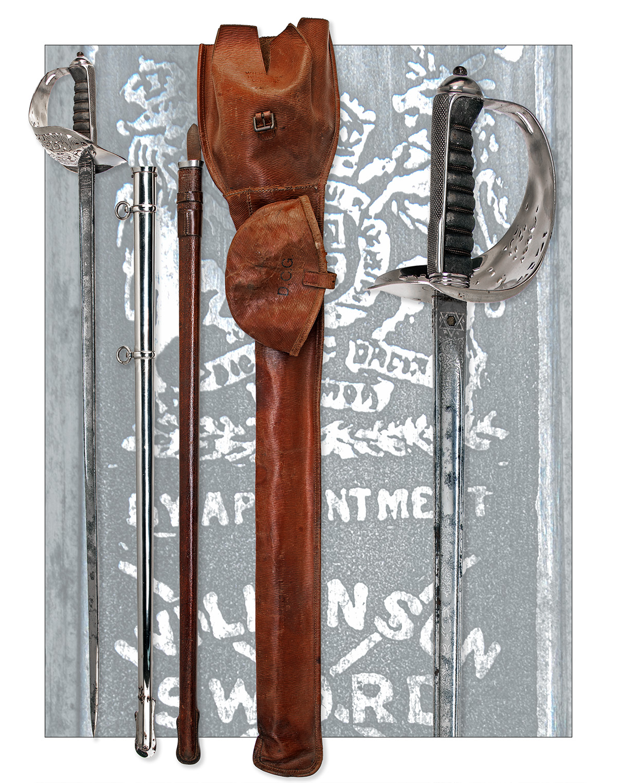 serial number 61936 dates to 1930, with 32 1/2in. unsharpened edges with central fuller to each side, etched to both sides with foliate scroll-work, crown and Royal coat-of-arms, George V Imperial cypher and two panels one blank, the other with the initials 'D.C.G.', blade spine with serial number, ricasso with brass Wilkinson proved plug to one side and maker's details over, nickelled steel hilt, pierced bowl guard with George V Imperial cypher, wire-bound fish-skin grip, with a clean and lightly used brown leather field scabbard marked for Wilkinson, a nickelled steel scabbard with two suspension rings, plus a brown leather case marked for Wilkinson with the flap carrying the initials 'D. C. G.', some small patches of staining to the blade, stitching failing at the throat of the field scabbard, steel scabbard with rusting at the chape, case worn with the lid separated through failed stitching