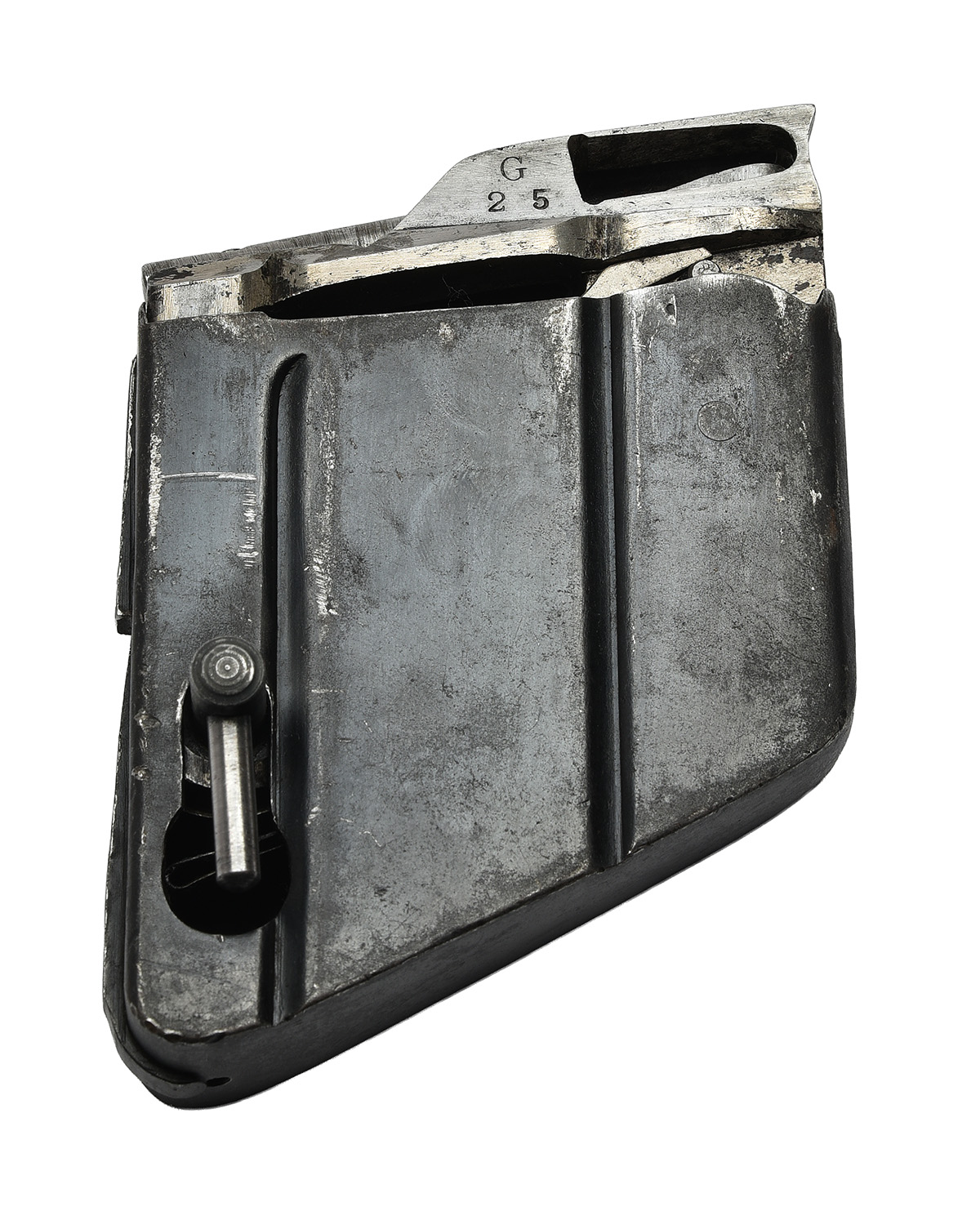 circa 1917 and in the form of the standard ten-round Enfield box-magazine, the interior replaced with a complex machined bullet feed with spring-loaded rammer, the top markings erased, the left hand side with loaded viewing aperture, the right side with lever to allow single loading of alternate ammunition, some finish wear with mild pitting