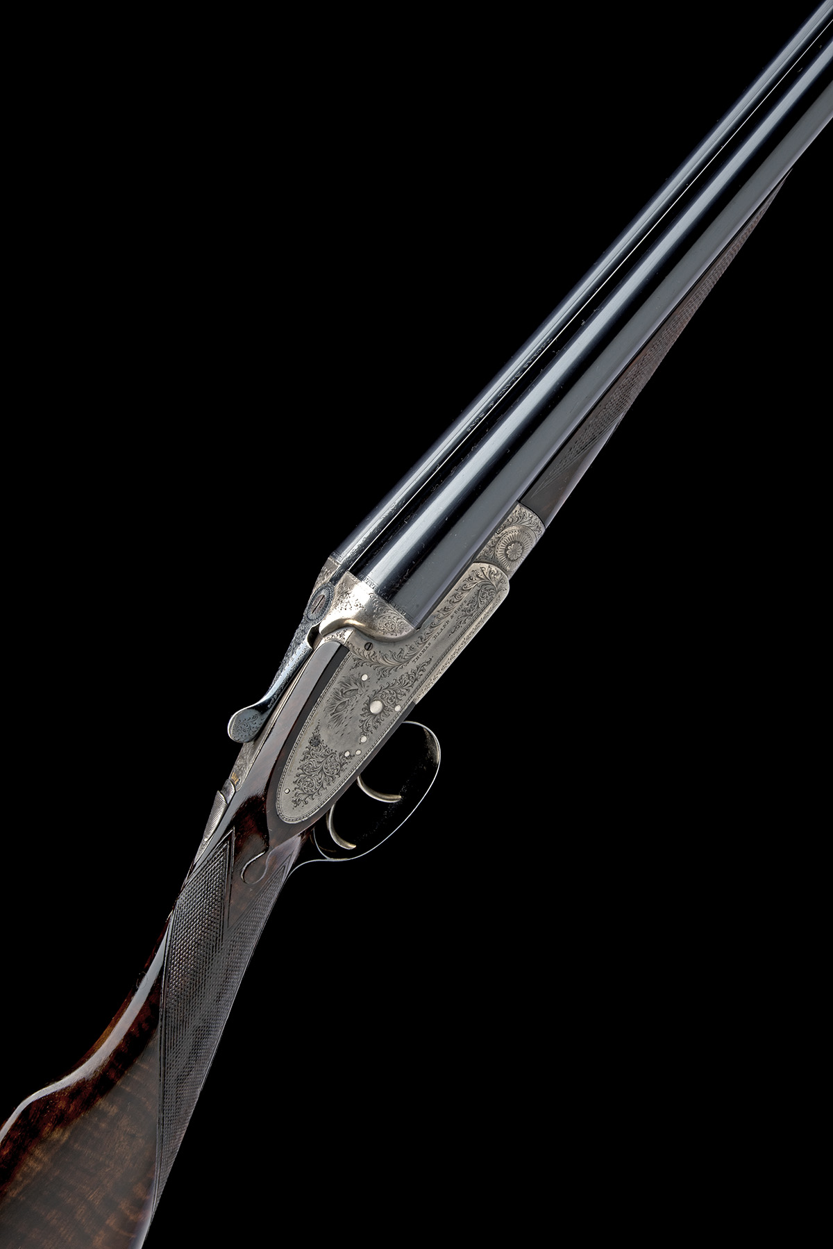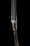 for 1934, 28in. nitro barrels, the rib engraved 'THOMAS BLAND & SONS', 2 1/2in. chambers, bored approx. imp. cyl. and 1/2 choke, treble-grip action, automatic safety with gold-inlaid 'SAFE' detail, bold acanthus scroll engraving, the lockplates with beaded bordering and central scenes of game birds, retaining slight traces of colour-hardening, 14 1/2in. figured stock including buttplate, weight 7lb., in a canvas case