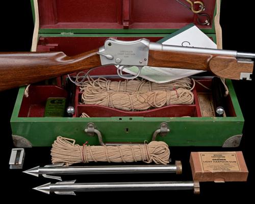 take-down nickel finish example, proofed for .38 Special Blank, 14.5GRs No.5 Cordite, 16 oz. harpoon, manual safety lever, action engraved 'W. W. GREENER. MAKER. BIRMINGHAM. ENGLAND.' and 'GREENER'S LIGHT HARPOON GUN.', in its wood case with lines, guides and harpoons, cleaning kit, two empty boxes with Greener Light Harpoon Gun blank cartridges' labels and a reprint of 'The Greener Light Model Harpoon Gun' sales brochure