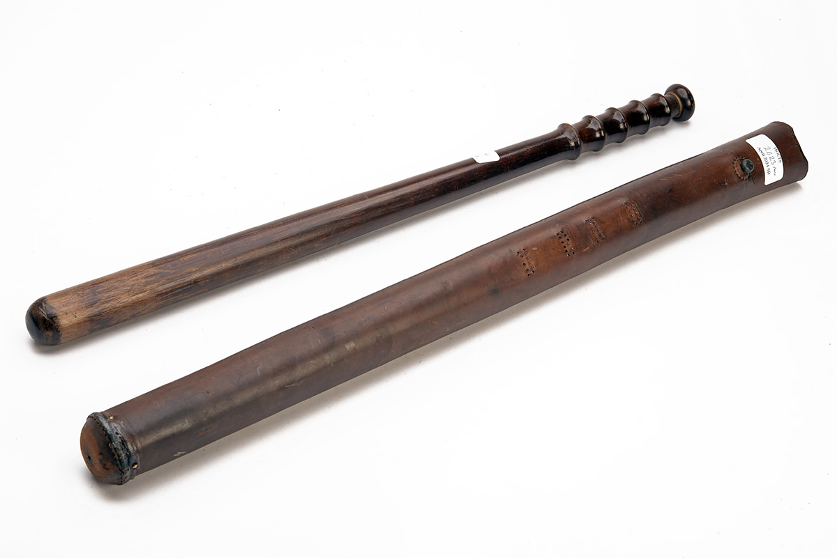 A TRUNCHEON FOR MOUNTED POLICE, British circa 1950, with plain body and finger-grooved round grip-piece, 24in. overall and with its leather spring-assisted scabbard (wrist thong and retaining strap absent