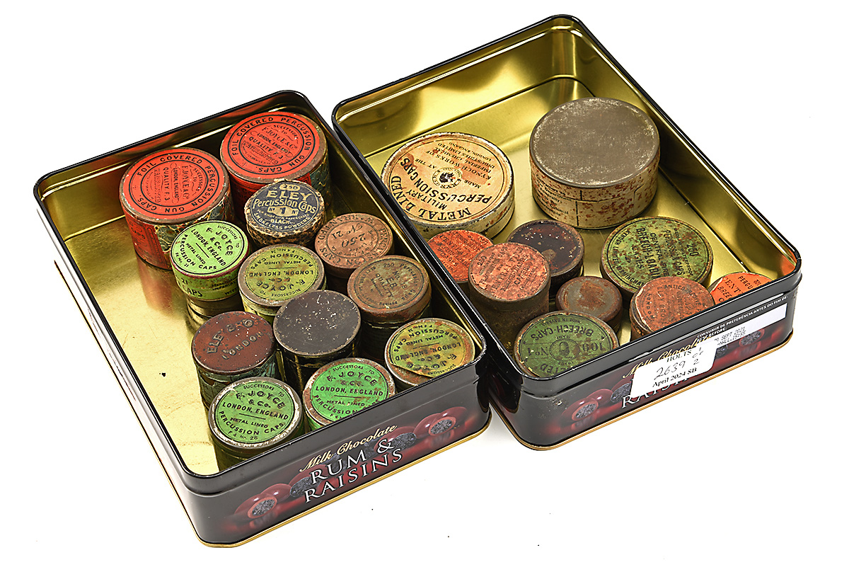 A GOOD COLLECTION OF 23 VINTAGE AND ANTIQUE CAP and PRIMER-TINS, MOST WITH CONTENTS, including 14 cap-tins, 8 early priming and anvil tins and one tin for bulleted caps