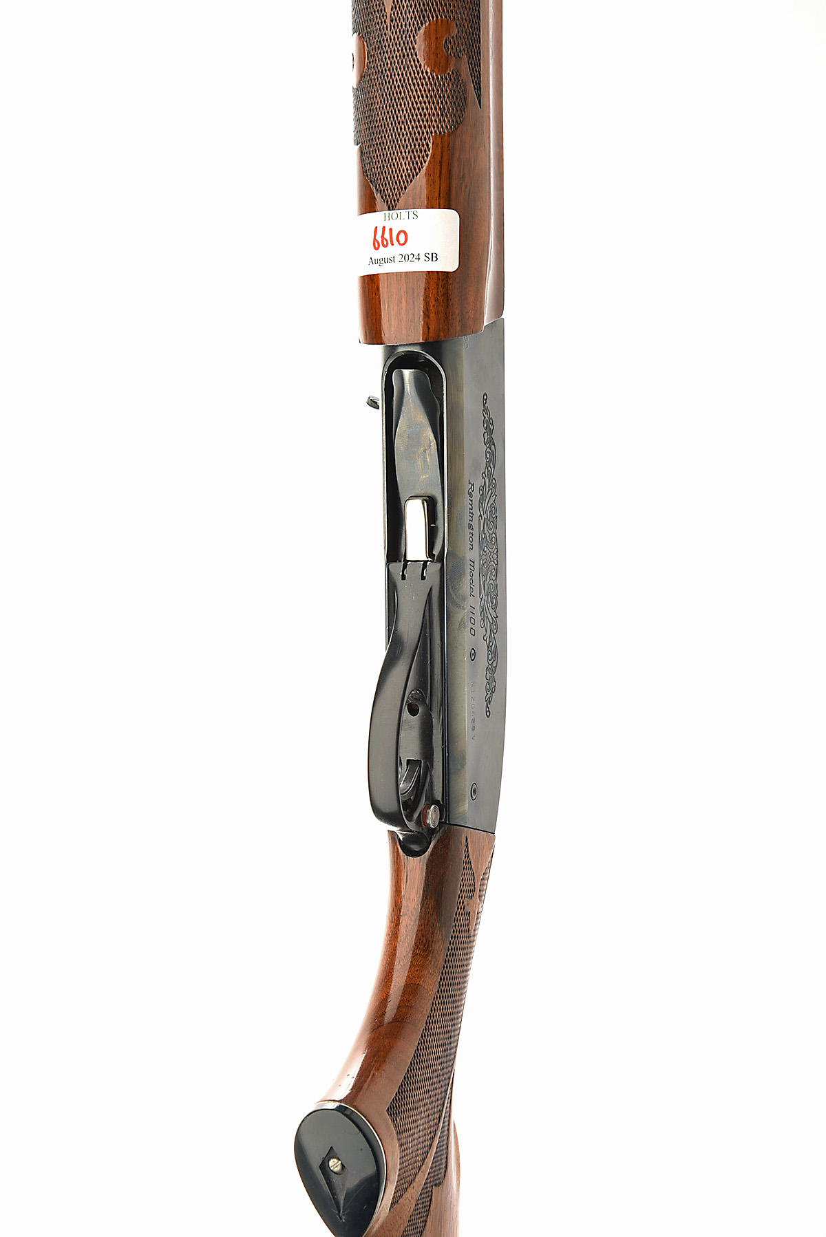 REMINGTON 12-BORE 'MODEL 1100' SEMI-AUTO SHOTGUN, serial no. N120629V, circa 1980, restricted magazine, 25 1/2in. nitro barrel with 8mm ventilated matt rib, 2 3/4in. chamber, bored approx. true cyl., manual push-button safety, blacked action with acanthus scroll engraving, 14 3/4in. ornately chequered pistolgrip stock including ventilated rubber recoil pad