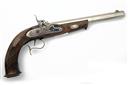 A REPRODUCTION .45 PERCUSSION PISTOL SIGNED ARDESA, MODEL 'W. PARKER, LONDON', serial no. 14-13-017340-10, with stainless? 10 1/2in. octagonal barrel, border engraved lock, walnut half-stock with chequered grip , set trigger and spurred trigger guard, appearing little used