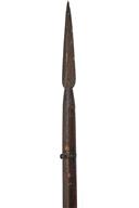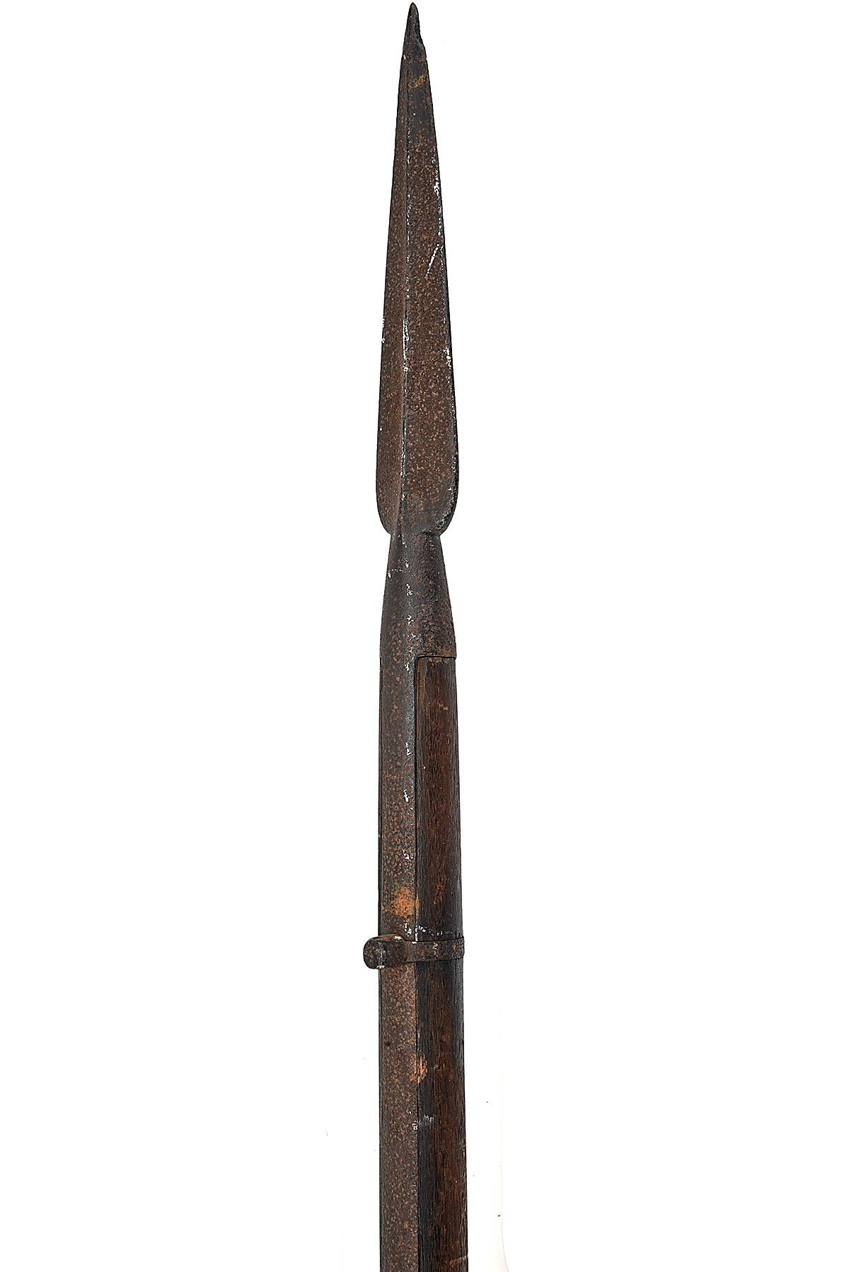 A RARE VICTORIAN CAVALRY LANCE, circa 1850, with socket-mounted iron spear point of 6 in. further attached to the shaft with two 16 in. langets bound with three iron bands, each with a drilled-through button for attaching a pennant, the shaft has a socket-mounted narrowing iron 5 1/2 in. terminal with short 1 1/2 in, langets, pitting to the ironwork, appears all original with consistent wear indicating this is as issued and not a marriage, approx. 9 3/4 feet total length