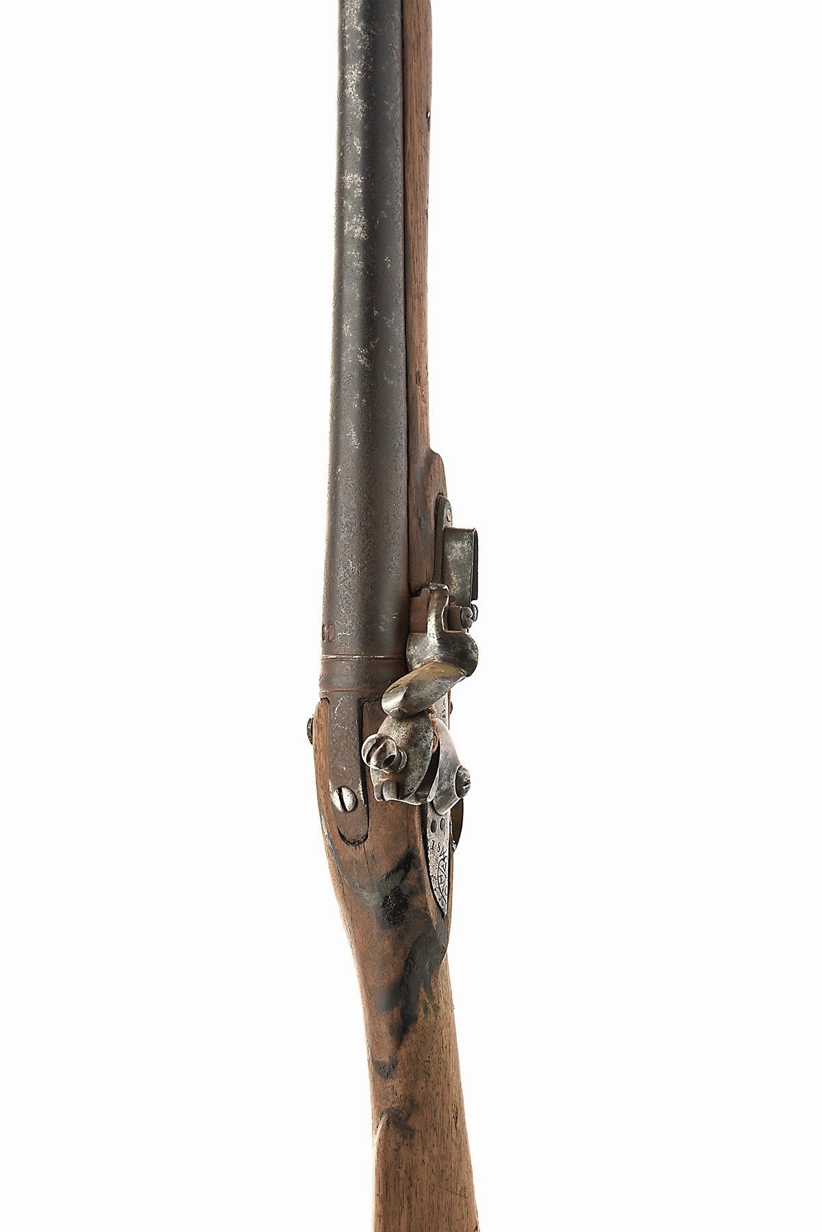 A .750 FLINTLOCK EAST INDIA COMPANY BROWN-BESS MUSKET SIGNED BAKER, no visible serial number, dated for 1805, with round iron 39in. barrel (currently partially obstructed), signed lock dated at the tail together with the E.I.C. heart trademark, walnut full-stock (cleaned of finish, small losses), brass furniture and iron ramrod (frozen)