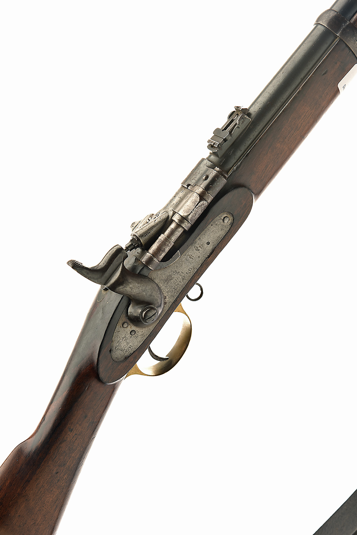 A .577 (SNIDER) MKII ARTILLERY CARBINE SIGNED ENFIELD, gun no. 625, dated for 1871, with 21 1/2in. barrel, flip-open breech numbered '188'and signed 'BSA Co.', the top-tang numbered '625' and marked 'H.A.', signed and dated lock, walnut half-stock with brass furniture, the heel-plate also numbered '625' along with some crossed-out volunteer markings on the spur, two iron barrel bands, bayonet lug, replacement nose-cap and fitted with a period black leather sling