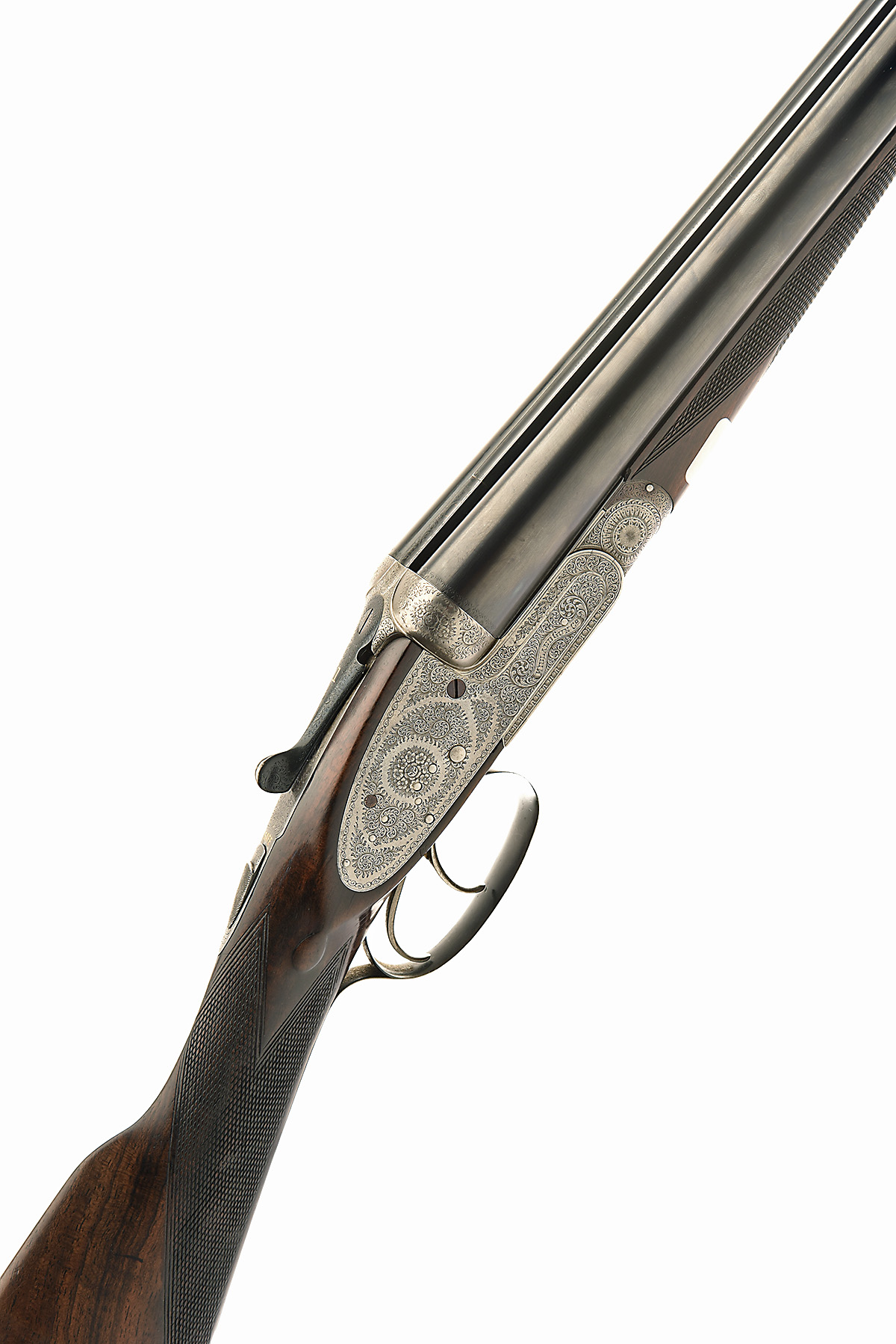 MIDLAND GUN CO. 12-BORE SIDELOCK EJECTOR, serial no. 23580, circa 1920, serial number on barrels only, 28in. replacement nitro barrels, rib engraved 'BARRELS BY GALLYON & SON LTD. CAMBRIDGE.', 2 1/2in. chambers, bored approx. 1/4 and 3/4 choke, treble-grip action with hidden third bite, toplever gold-inlaid '1', automatic safety with gold-inlaid 'SAFE' detail, border and acanthus scroll engraving with floral bouquets, brushed finish, 15in. figured stock including 1in. wooden extension, weight 6lb. 13oz.